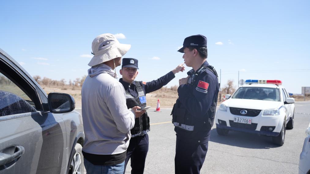 阿拉善邊境管理支隊(duì)民警在發(fā)射場(chǎng)外圍疏散來(lái)往車輛。