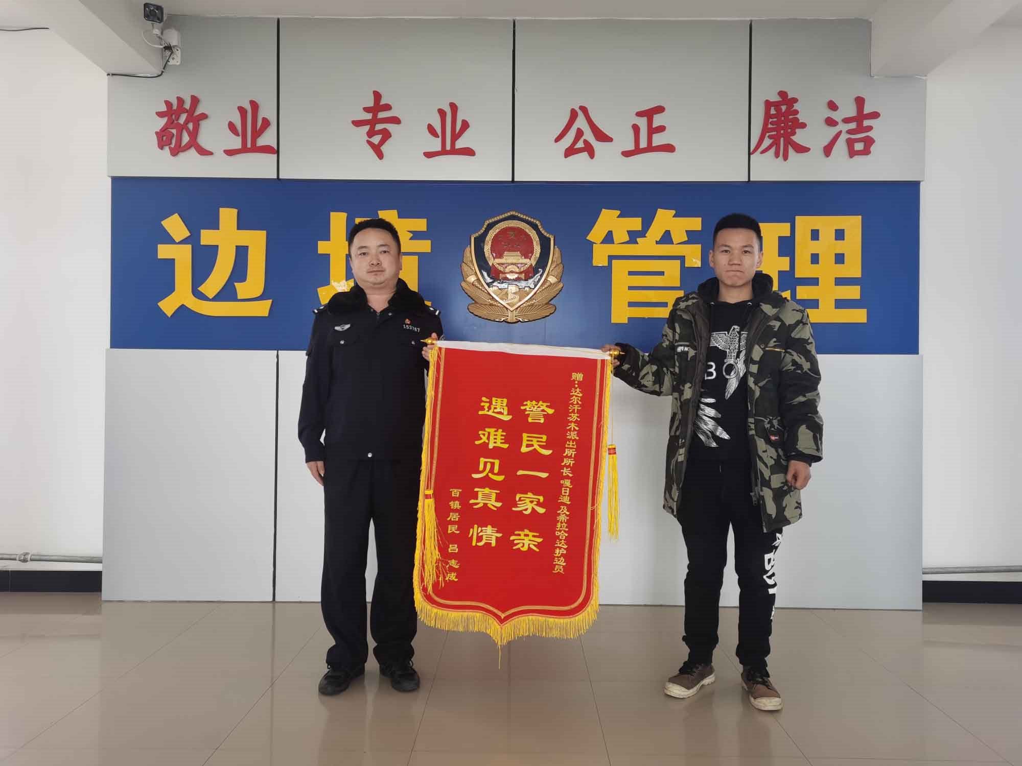 “民警同志太感謝你們了,有你們?cè)谖覀兙透杏X安心多了。”1月19日早晨,內(nèi)蒙古包頭市達(dá)茂旗達(dá)爾罕蘇木牧民那木吉拉“嘎吱嘎吱”的踩著潔白的積雪走進(jìn)包頭邊境管理支隊(duì)達(dá)爾罕邊境派出所,一邊說著一邊拿出印有“警民一家親,遇難見真情”的錦旗遞給民警。