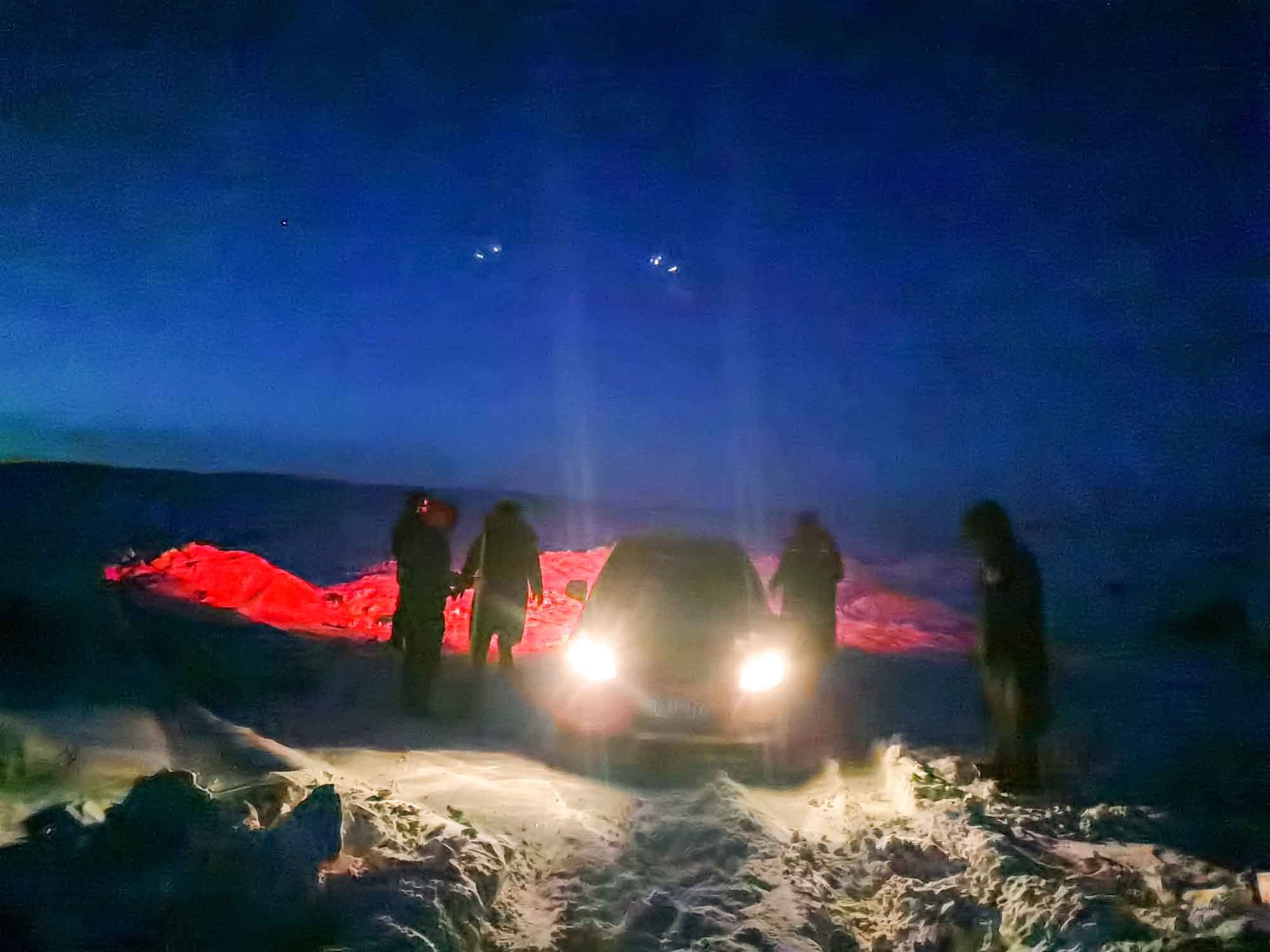 1月17日17時(shí),那木吉拉與弟弟一同駕車返回百靈廟鎮(zhèn),在途經(jīng)一處被風(fēng)谷地時(shí),由于晚上視線較差,且此處坡度較大,不慎陷入雪中無法動(dòng)彈,只得撥通電話請(qǐng)求派出所救助。草原上沒有遮蔽物,常常到了下午就刮起大風(fēng),吹得積雪覆蓋在土地上分不清地勢(shì)高低,民警們按著平日下鄉(xiāng)走訪的經(jīng)驗(yàn)摸索前進(jìn),經(jīng)過近一小時(shí)才到達(dá)現(xiàn)場(chǎng),了解情況后,民警們將準(zhǔn)備好的熱水和棉大衣遞給牧民便展開了救援工作。在零下35度的冬夜里,民警們用鐵鍬和雙手經(jīng)過近兩個(gè)小時(shí)的奮戰(zhàn)終于將40厘米厚的積雪清理干凈,并將被困車輛通過前拉后推的方式移至平坦區(qū)域。