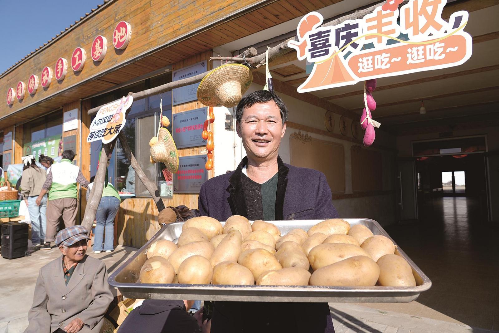 豐收節(jié)上,一村民端著自家種的土豆供人們免費(fèi)品嘗。