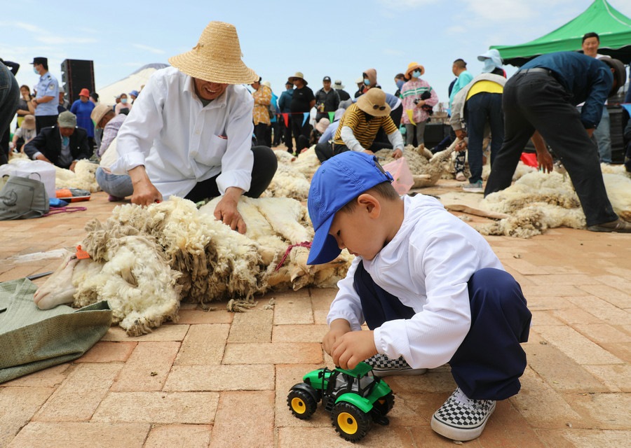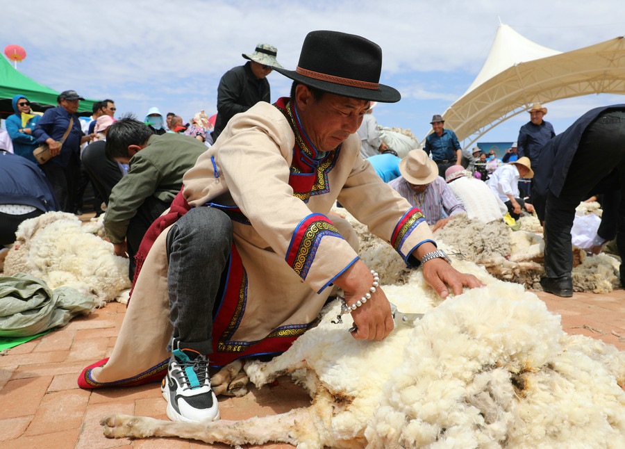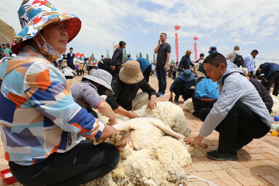 在同步舉行的剪羊毛大賽中,參賽選手們用剪刀和電動(dòng)剪毛機(jī),在細(xì)毛羊身上翻飛操作,牧民們熟練的身手和精湛的技藝,使一只只羊片刻之間“脫胎換骨”。