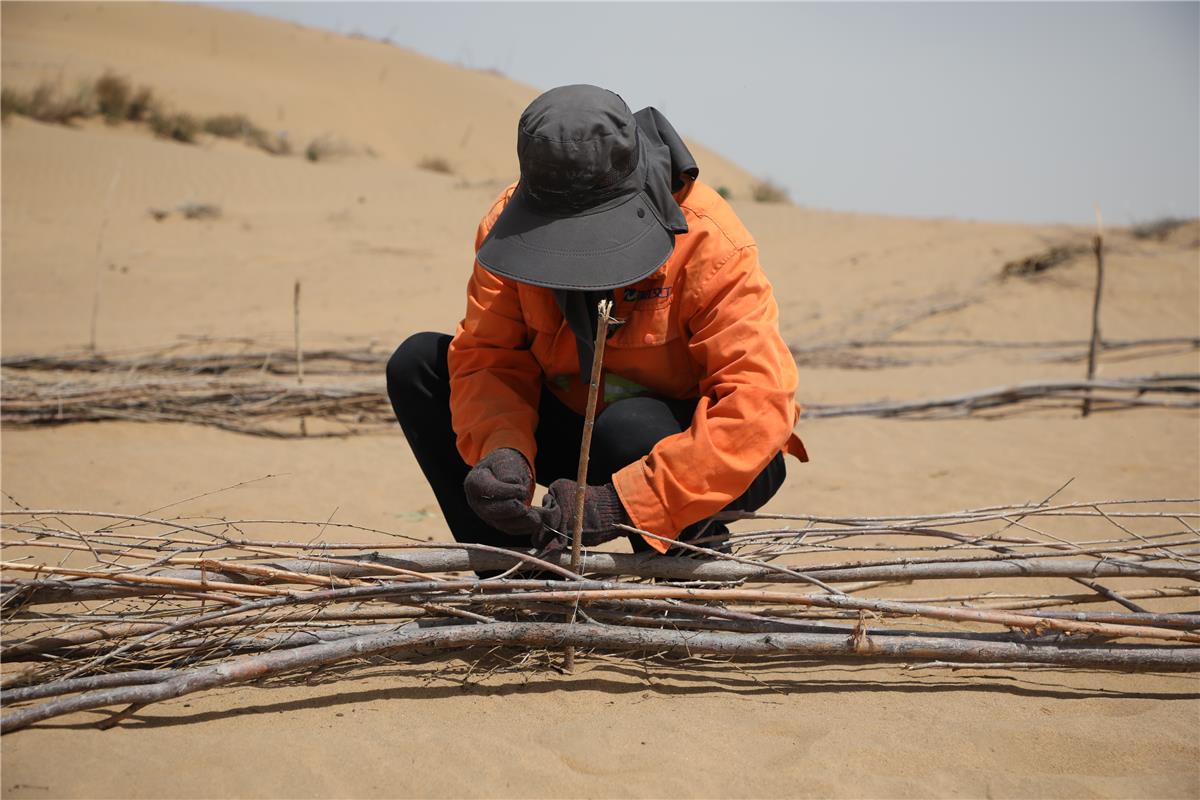 在鄂爾多斯市庫布其沙漠S215穿沙公路沙化土地綜合治理項(xiàng)目現(xiàn)場,工人正在鋪設(shè)沙障。(資料圖)