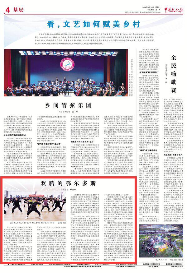 2026年1月26日《中國文化報》第4版刊發(fā)了《歡騰的鄂爾多斯》的文章,報道了廣場舞《歡騰鄂爾多斯》已成為鄉(xiāng)村日?;顒印⒐?jié)慶聚會的亮點內(nèi)容,讓群星獎的光芒照亮了基層的舞臺。作品自惠民演出以來,便以濃郁的民族風(fēng)情和強烈的藝術(shù)表現(xiàn)力深受群眾歡迎。