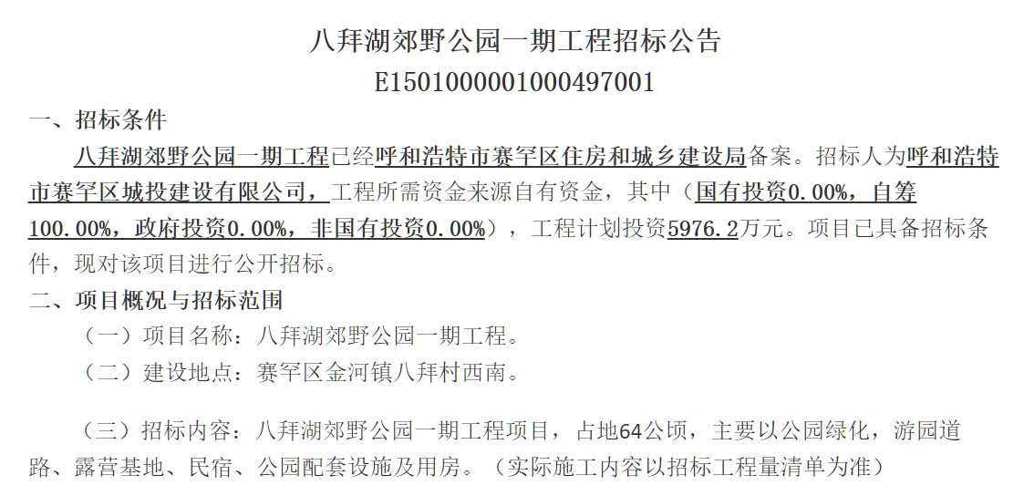 7月5日,記者從呼和浩特市公共資源交易監(jiān)督管理局了解到,八拜湖郊野公園一期工程已經(jīng)呼和浩特市賽罕區(qū)住房和城鄉(xiāng)建設(shè)局備案,項目已具備招標條件,啟動公開招標。