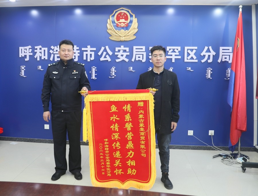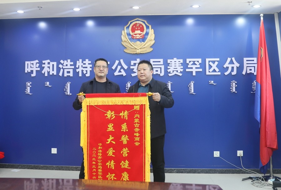 賽罕區(qū)副區(qū)長、公安分局局長趙新龍,政委郭震乾等領導熱情接待了商會和愛心企業(yè)負責人,并向商會及愛心企業(yè)贈送錦旗以示感謝。