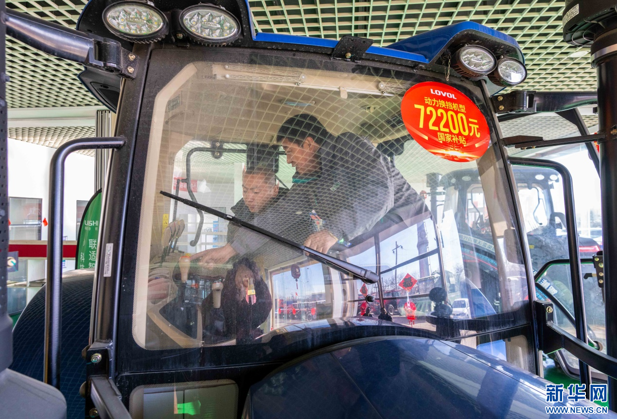 ??2月18日,在位于呼和浩特市玉泉區(qū)的一家農(nóng)機設(shè)備公司展銷大廳,農(nóng)戶在咨詢選購國家補貼拖拉機。新華網(wǎng)發(fā)(丁根厚 攝)