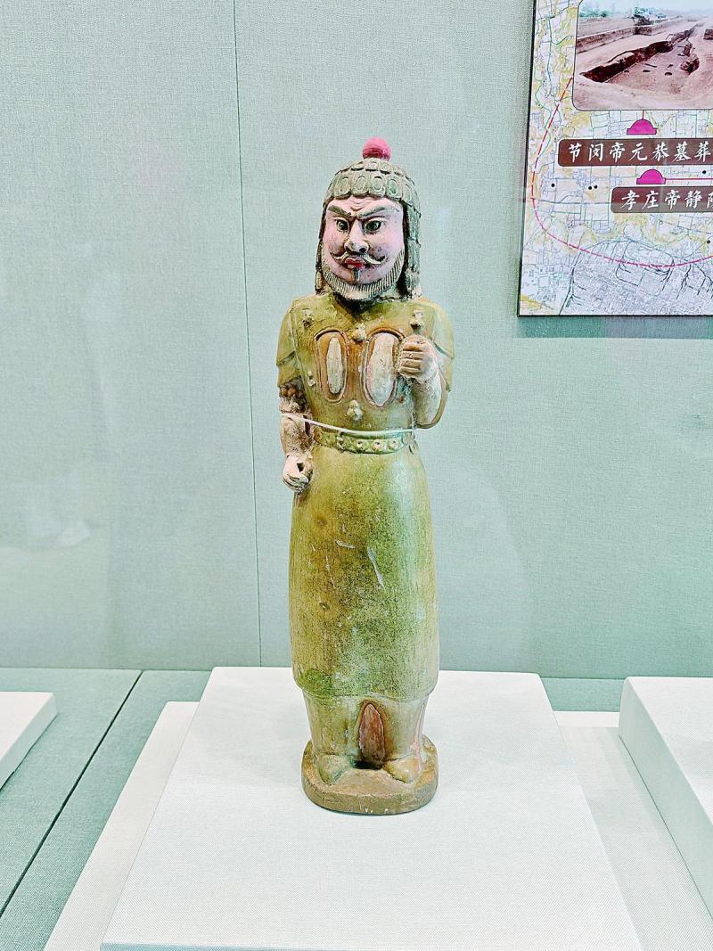 展覽中,呼倫貝爾的嘎仙洞遺址出土的石鏃、骨錐等,見證了拓跋鮮卑早期的生活遺跡;內(nèi)蒙古博物院藏的鹿角金步搖冠精美華麗,鹿頭面部鑲嵌有珠飾,鹿角支叉上所掛的桃形金葉均可搖動,象征著草原民族對于鹿的崇拜;釉陶馬、青釉武士俑,展示了拓跋鮮卑強大的騎兵力量;從大同出土的彩繪陶女舞俑到洛陽出土的彩繪陶伎樂俑,體現(xiàn)了北魏在漢化改革前后的服飾變化、音樂舞蹈和社會生活。
