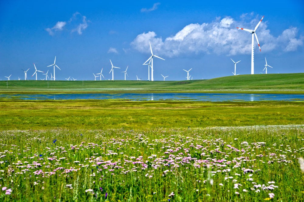 “輝騰錫勒”蒙古語意為“清涼的山崗”,因風力資源豐富而得名,是建設風電場理想的場所。如今,一排排風電機猶如“白色森林”,碩大的風翼就像一架架“大風車”,在草原勁風吹動下緩緩轉動,形成另一大景觀。