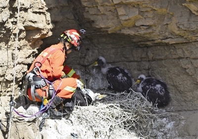 當(dāng)天7時(shí)左右,在烏海市海勃灣區(qū)甘德爾山景區(qū)半山腰處,攝影愛好者焦長(zhǎng)青在拍攝時(shí)發(fā)現(xiàn)了一窩出生20多天的幼年野生黑鸛,其中一只黑鸛行動(dòng)異常,疑似受傷。他立即撥打了119報(bào)警電話,同時(shí)聯(lián)系了烏海市野生動(dòng)物保護(hù)部門。9時(shí)許,烏海市消防支援支隊(duì)光明路特勤站和烏海市野生動(dòng)物保護(hù)部門的工作人員到達(dá)現(xiàn)場(chǎng)。經(jīng)勘查,在距離懸崖正下方大約30米處的巖洞內(nèi),一只幼年黑鸛被尼龍繩纏繞住腿部而受傷,不能行動(dòng)。消防員隨后尋找合適的位置制作錨點(diǎn)。消防員陳意攜帶救援裝備速降到懸崖下方展開營(yíng)救,一個(gè)小時(shí)之后,受傷的幼年黑鸛被成功救出,并送往海勃灣區(qū)林業(yè)草原局救助站進(jìn)行救治。