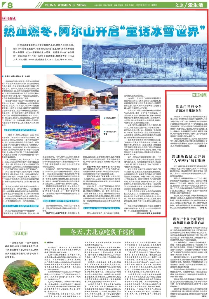 2025年12月2日,《中國婦女報》第8版刊發(fā)題為《熱血燃冬,阿爾山開啟“童話冰雪世界”》的新聞,報道了阿爾山,這座地處內蒙古自治區(qū)興安盟的東北小城,近年來憑借獨特的地理優(yōu)勢、豐富的旅游資源和當地政府文旅部門精心推出的“寵客”政策,吸引了國內外大批游客,成為冬季體驗冰雪快樂的打卡地。