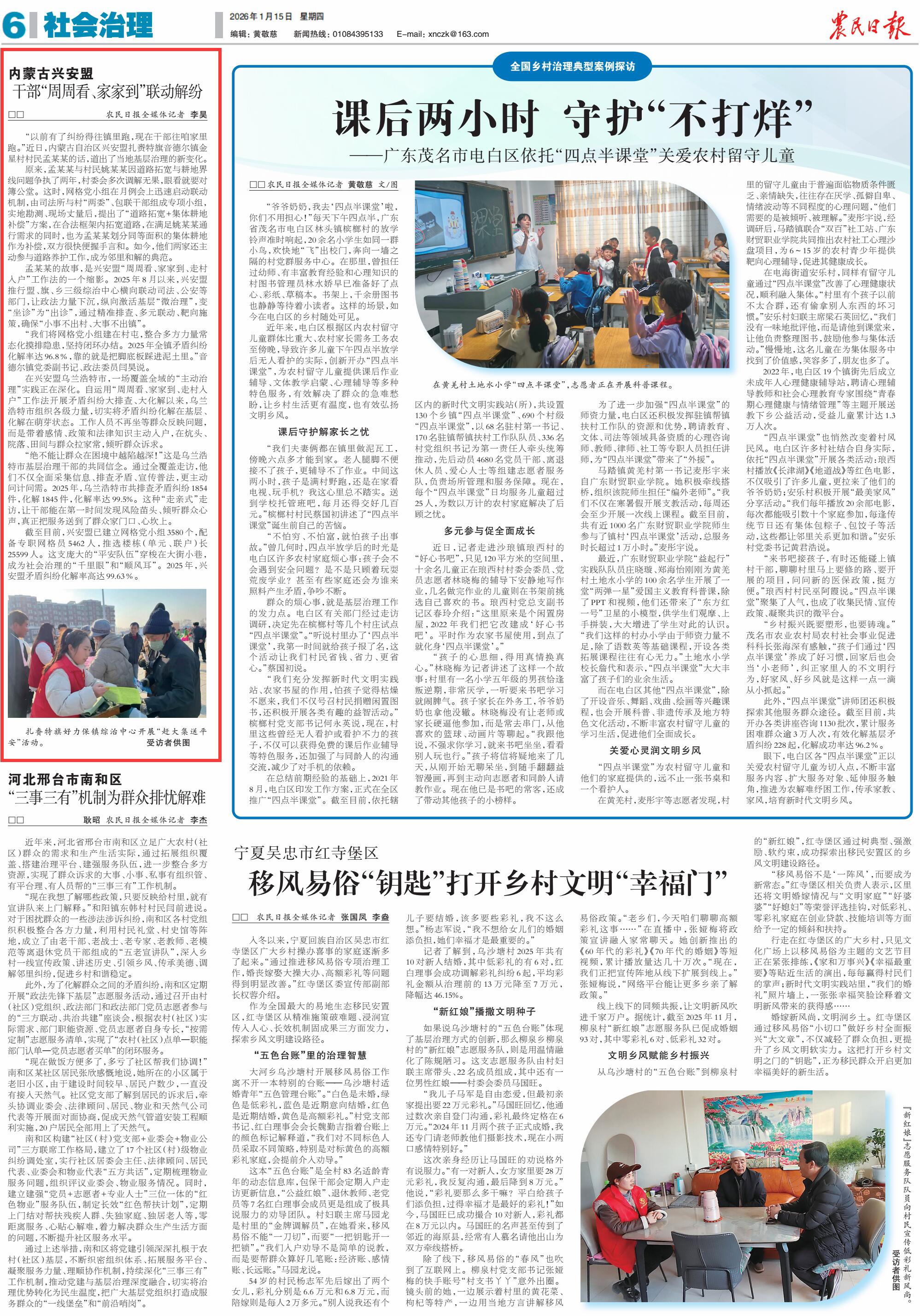 2026年1月15日,《農(nóng)民日報》第6版刊發(fā)題為《內(nèi)蒙古興安盟 干部“周周看、家家到”聯(lián)動解紛》的文章,報道了2025年8月以來,興安盟推行盟、旗、鄉(xiāng)三級綜治中心橫向聯(lián)動司法、公安等部門,讓政法力量下沉,縱向激活基層“微治理”,變“坐診”為“出診”,通過精準排查、多元聯(lián)動、靶向施策,確?!靶∈虏怀龃濉⒋笫虏怀鲦?zhèn)”。