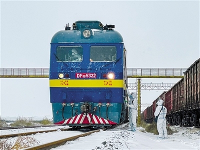 11月6日,二連出入境邊防檢查站執(zhí)勤民警頂風(fēng)冒雪,對(duì)通關(guān)列車進(jìn)行檢查驗(yàn)放。日前,二連浩特市出現(xiàn)降雪、強(qiáng)降溫天氣,最低溫度降至零下15℃。二連出入境邊防檢查站民警積極做好惡劣天氣下疫情防控、通關(guān)服務(wù)保障工作,全力保障口岸通關(guān)安全順暢。(記者 安寅東 攝)