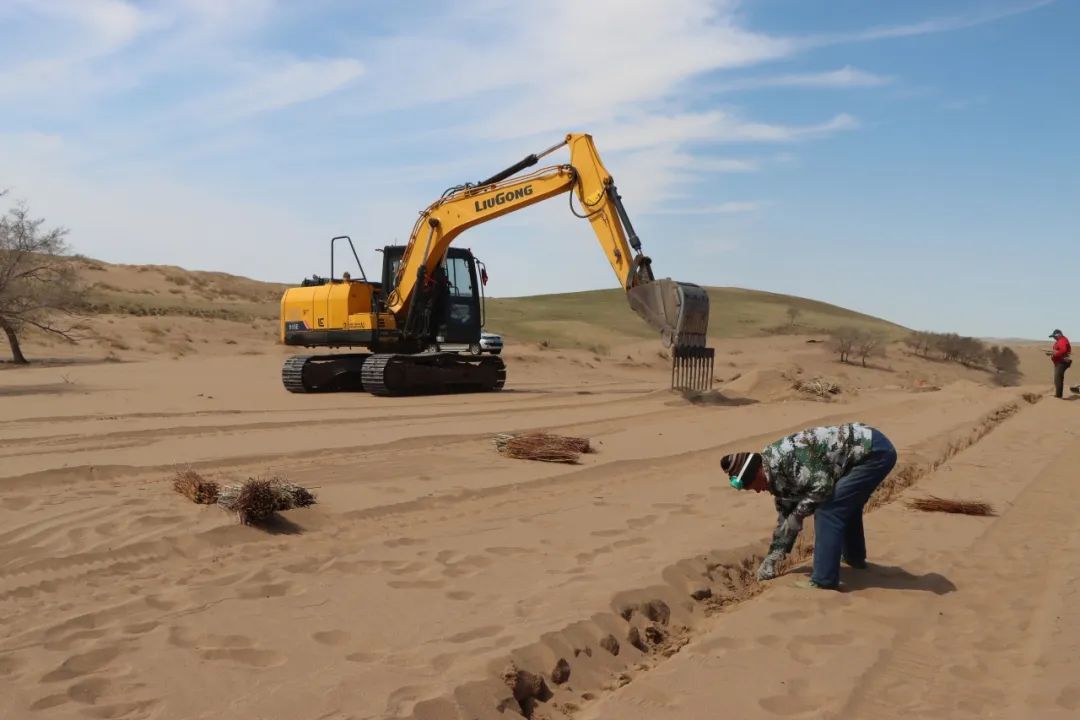 據(jù)錫林浩特市二蛋牧民養(yǎng)殖專業(yè)合作社負(fù)責(zé)人介紹,在傳統(tǒng)的沙漠治理作業(yè)中,工人需要手動栽植黃柳等固沙植物。然而,人工種植不僅效率低,勞動強(qiáng)度也大。為突破這一困境,合作社成員經(jīng)過多次試驗(yàn),最終決定對挖掘機(jī)進(jìn)行創(chuàng)新改造,加裝叉具,這一巧妙的設(shè)計(jì)不僅實(shí)現(xiàn)了對黃柳種植深度和間距的精準(zhǔn)把控,還能有效避免土壤翻動,最大程度地保持了土壤水分,切實(shí)保護(hù)了沙地的生態(tài)環(huán)境。