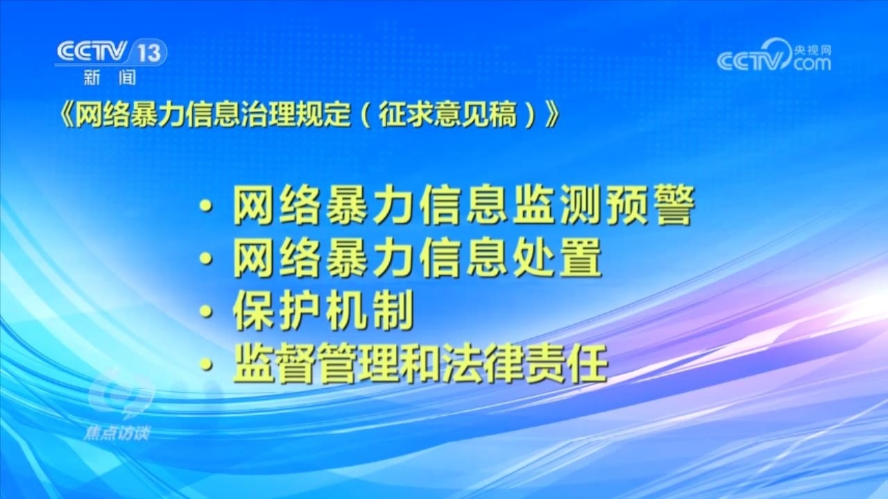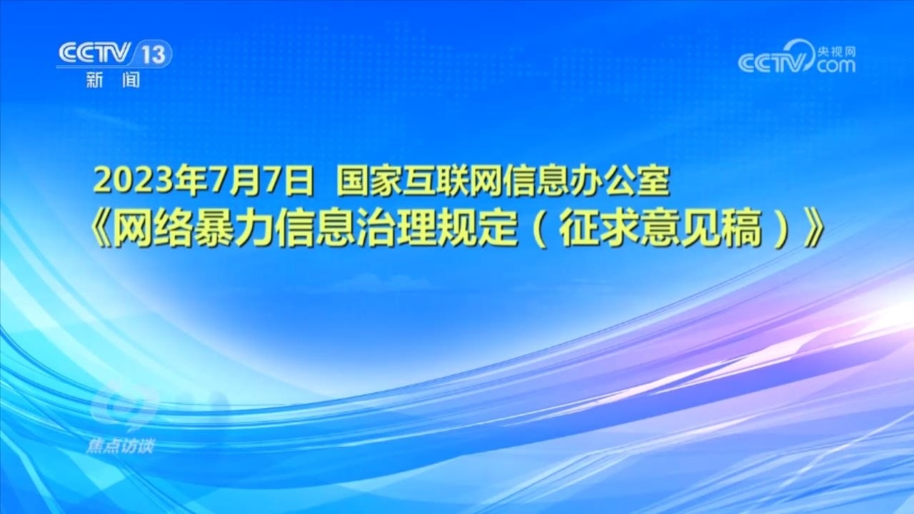 央視網(wǎng)消息(焦點(diǎn)訪談):俗話說“舌上有龍泉,殺人不見血”。網(wǎng)絡(luò)暴力不同于現(xiàn)實(shí)中的拳腳相加,但是這些在網(wǎng)絡(luò)空間中用文字、圖片等方式進(jìn)行的傷害和侮辱,一樣可以對(duì)當(dāng)事人的現(xiàn)實(shí)生活產(chǎn)生惡劣的影響,讓當(dāng)事人的心靈“流血”。在傷害當(dāng)事人的同時(shí),網(wǎng)絡(luò)暴力行為也嚴(yán)重污染了互聯(lián)網(wǎng)環(huán)境,影響社會(huì)和諧穩(wěn)定。近日,國家互聯(lián)網(wǎng)信息辦公室起草了《網(wǎng)絡(luò)暴力信息治理規(guī)定(征求意見稿)》,向社會(huì)公開征求意見;同樣是針對(duì)網(wǎng)絡(luò)暴力,在6月,最高人民法院、最高人民檢察院、公安部起草了《關(guān)于依法懲治網(wǎng)絡(luò)暴力違法犯罪的指導(dǎo)意見(征求意見稿)》,面向社會(huì)公開征求意見。治理網(wǎng)絡(luò)暴力這顆“毒瘤”,營造良好生態(tài)勢(shì)在必行。