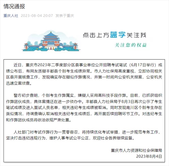·重慶通報事業(yè)單位招考作弊案:嫌疑人用高科技手段團(tuán)伙作弊,已抓獲組織作弊團(tuán)伙成員。