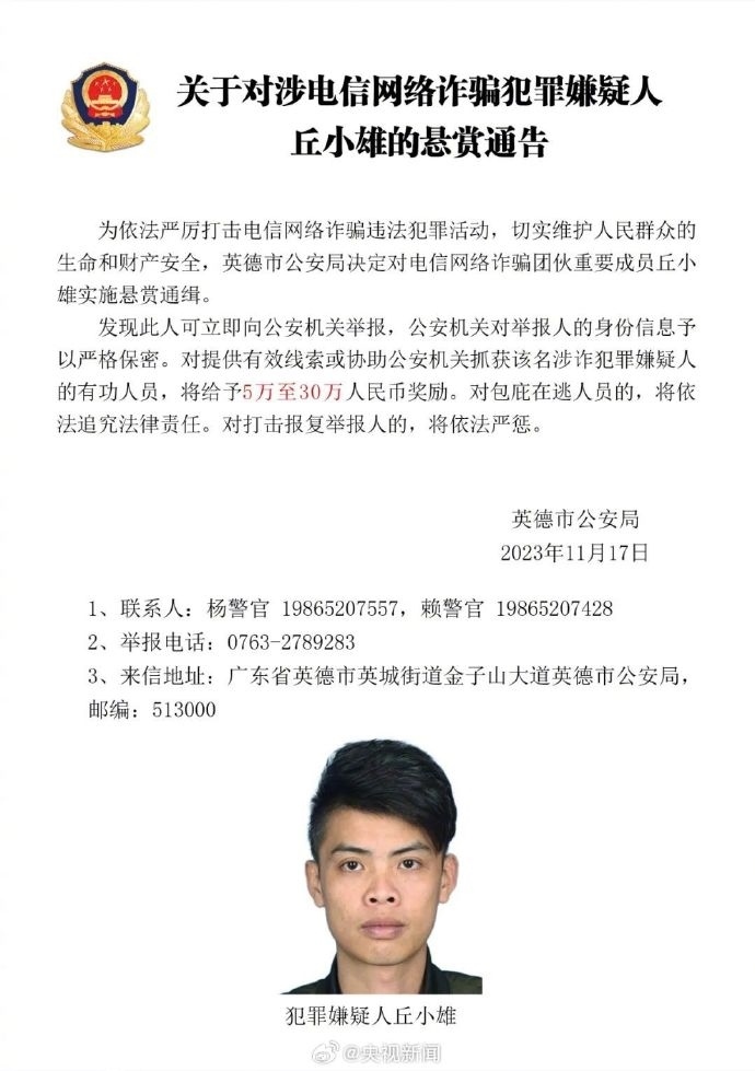 近日,廣東英德市公安局對(duì)電信網(wǎng)絡(luò)詐騙團(tuán)伙重要成員張永勝、丘小雄、徐培星、張方文、巫昌發(fā)、鄧寶運(yùn)、鄧海堅(jiān)實(shí)施懸賞通緝。發(fā)現(xiàn)上述人員立即向公安機(jī)關(guān)舉報(bào),對(duì)提供有效線索或協(xié)助公安機(jī)關(guān)抓獲該名涉詐犯罪嫌疑人的有功人員,將給予5萬至30萬人民幣獎(jiǎng)勵(lì)。