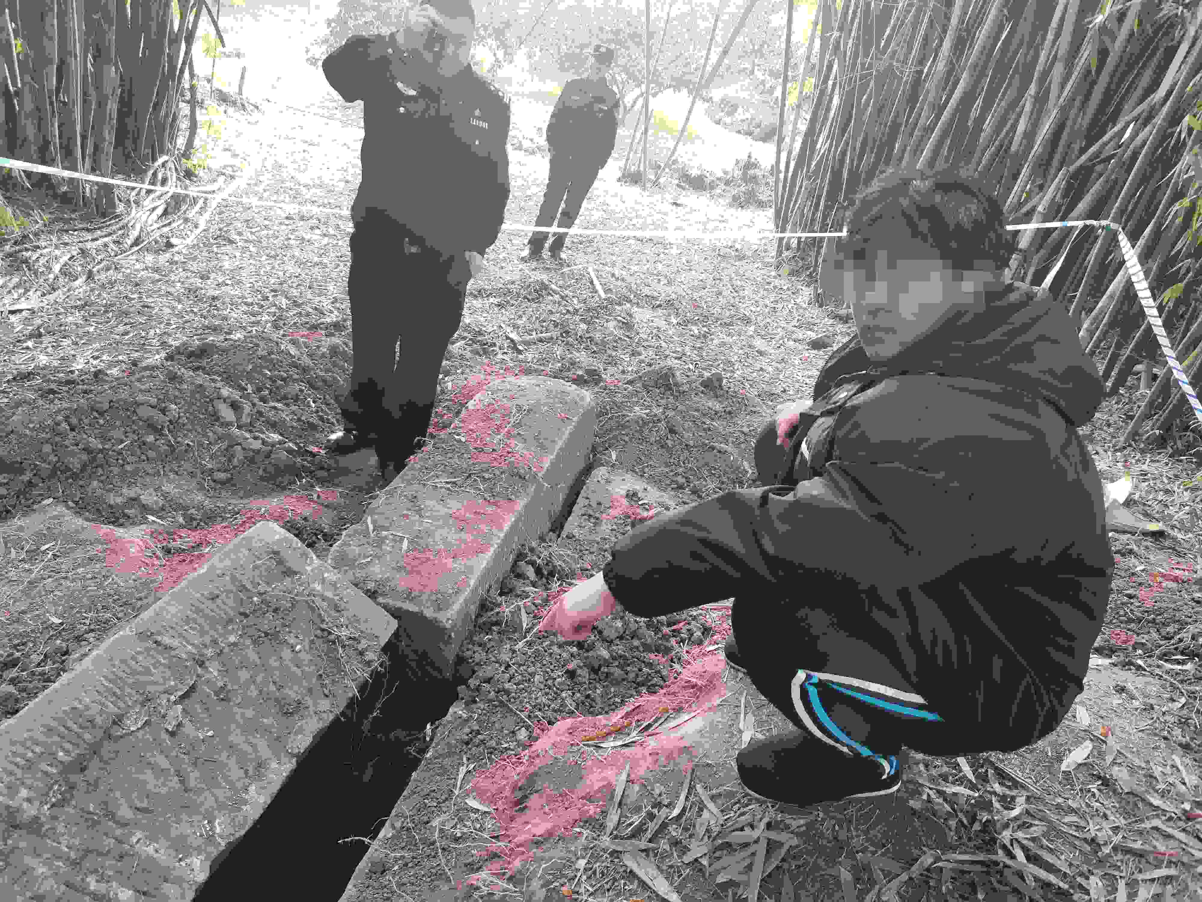 韓某家族的這座祖墳地處一片竹林中,離最近的房屋直線距離不足20米。為此,他趕到現(xiàn)場(chǎng)發(fā)現(xiàn),墓室上的土有多處被挖痕跡,但墓門上的石頭還沒被打開?!斑@個(gè)地方是條大路,白天也沒人看到有人來過?!表n某懷疑有人盯上了他家的祖墳,想要盜墓,并判斷那些人還會(huì)再來。