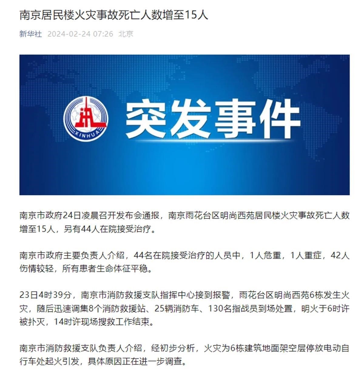 2月24日凌晨,南京市召開新聞發(fā)布會,通報(bào)雨花臺區(qū)“2·23”火災(zāi)事故有關(guān)情況。發(fā)布會上介紹,23日凌晨4時(shí)39分,南京市消防救援支隊(duì)指揮中心接到報(bào)警,雨花臺區(qū)明尚西苑6棟發(fā)生火災(zāi)。本次事故現(xiàn)場明火于當(dāng)日上午6時(shí)左右被撲滅,現(xiàn)場搜救工作于下午2時(shí)全部結(jié)束。截至23日24時(shí),事故共造成15人遇難,44人在院治療,其中,1人危重,1人重癥,42人傷情較輕,所有患者生命體征平穩(wěn)。南京市消防救援支隊(duì)負(fù)責(zé)人介紹,經(jīng)初步分析,火災(zāi)為6棟建筑地面架空層電動自行車停放處起火引發(fā),具體原因正在進(jìn)一步調(diào)查。