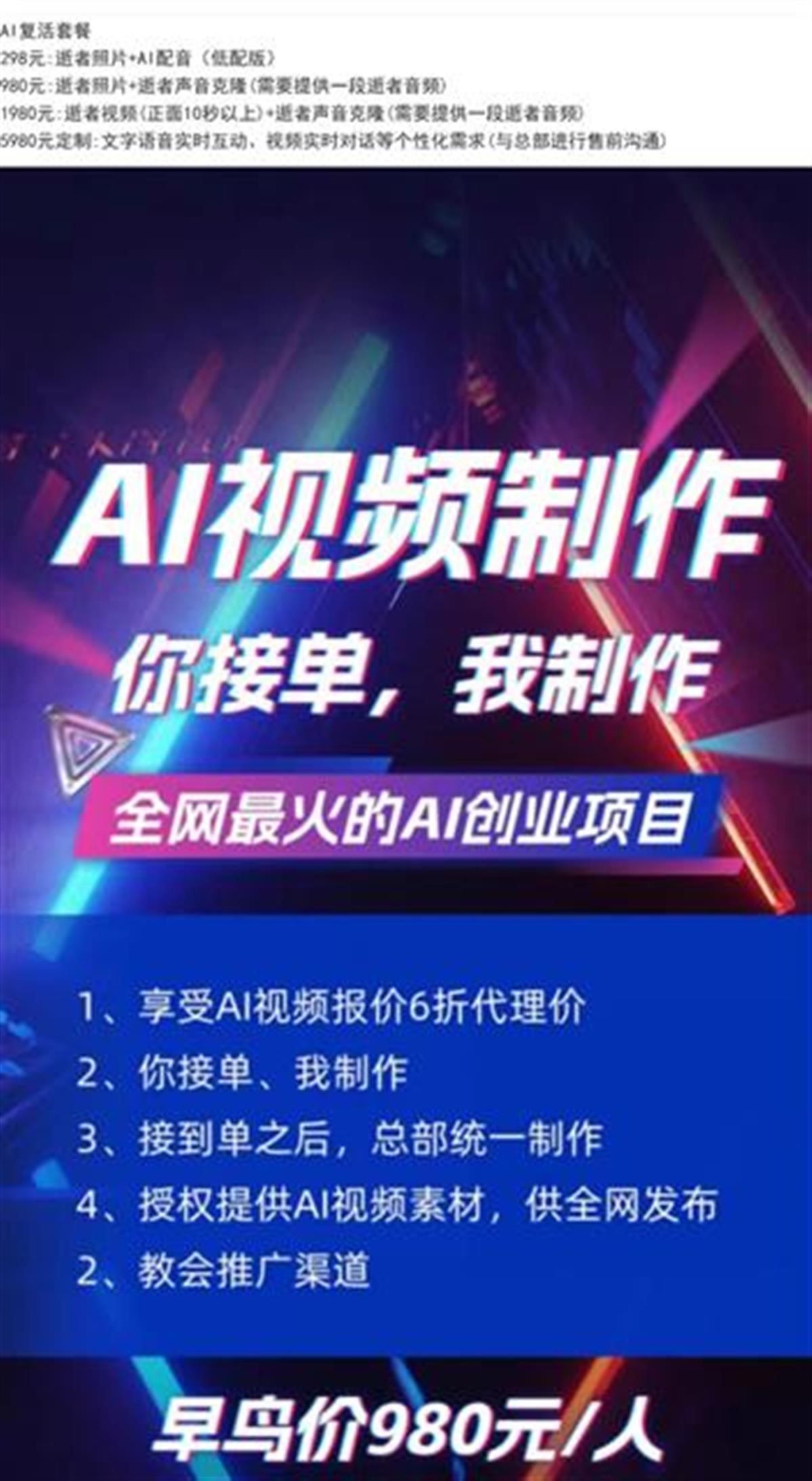 記者私信其中一名“AI復(fù)活師”詢問(wèn)能否制作已逝明星的定制說(shuō)話視頻,對(duì)方表示可以,且有多種模式可供選擇,需要添加微信了解詳情。對(duì)方提供的“AI復(fù)活套餐”包括“逝者照片+AI配音”“逝者照片+逝者聲音克隆”“逝者視頻+逝者聲音克隆”等服務(wù),價(jià)格從298元到1980元不等。除AI視頻服務(wù)外,這名“AI復(fù)活師”還表示正在收徒及尋找下游代理,可提供AI視頻制作教學(xué)服務(wù)。