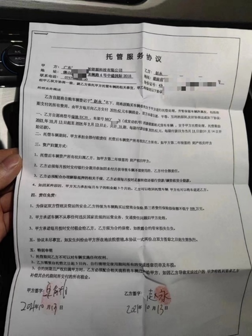 趙永開車來(lái)到位于廣東省佛山市的“車管部門”辦理“托管”手續(xù)。托管協(xié)議顯示,車輛由廣東智富卓越新能源科技有限公司托管處理,公司每月給趙永支付租金3000余元。