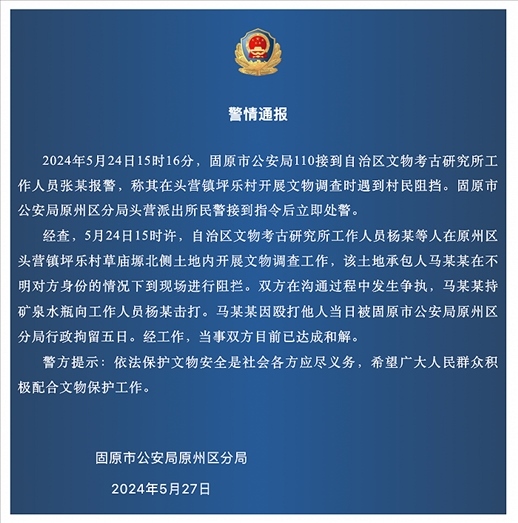 經(jīng)查,5月24日15時(shí)許,自治區(qū)文物考古研究所工作人員楊某等人在原州區(qū)頭營鎮(zhèn)坪樂村草廟塬北側(cè)土地內(nèi)開展文物調(diào)查工作,該土地承包人馬某某在不明對方身份的情況下到現(xiàn)場進(jìn)行阻攔。雙方在溝通過程中發(fā)生爭執(zhí),馬某某持礦泉水瓶向工作人員楊某擊打。馬某某因毆打他人當(dāng)日被固原市公安局原州區(qū)分局行政拘留五日。經(jīng)工作,當(dāng)事雙方目前已達(dá)成和解。