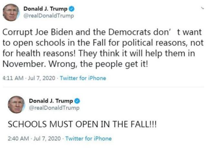他還在推特上指責(zé),拜登和民主黨人不希望學(xué)校秋季復(fù)課,是出于政治考慮,而非健康考慮。
