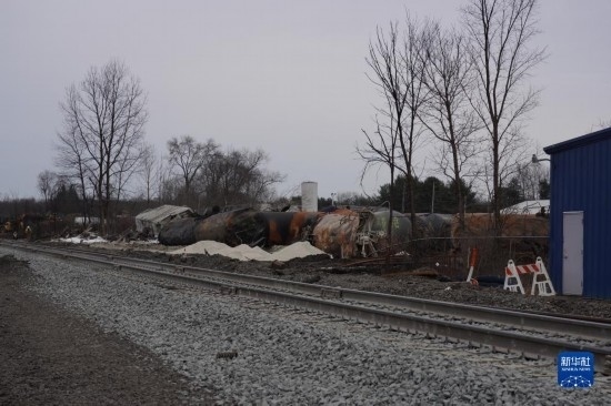這是2月14日在美國(guó)俄亥俄州東巴勒斯坦鎮(zhèn)拍攝的脫軌列車殘骸。新華社發(fā)(章焱飛攝)