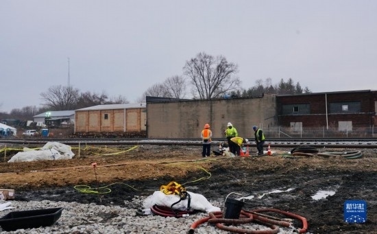 2月14日,在美國(guó)俄亥俄州東巴勒斯坦鎮(zhèn),工作人員在事故現(xiàn)場(chǎng)附近處理污水。新華社發(fā)(章焱飛攝)