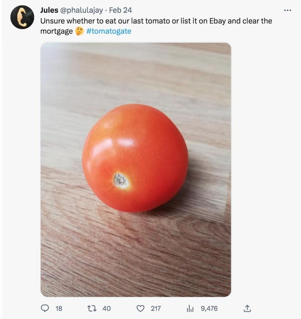 有英國網友在社交媒體上公布的賬單顯示,2月末他花費了25英鎊(折合人民幣206.53元)購買了一袋共6個西紅柿。還有英國網友調侃說,看著家里最后一個西紅柿,難以決定是把它吃掉,還是把它賣掉還房貸。