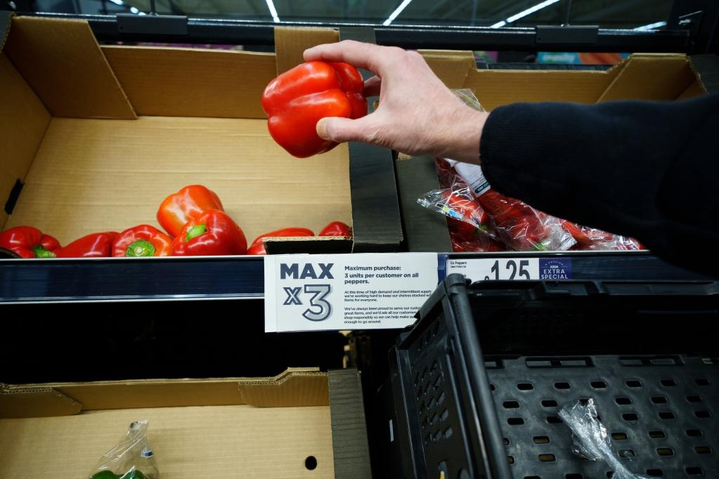 這是2月23日在英國曼徹斯特一家超市拍攝的蔬菜貨架上的限購通知。按照通知,每名顧客一次只能最多購買3個彩椒。新華社發(fā)(喬恩·休珀攝)