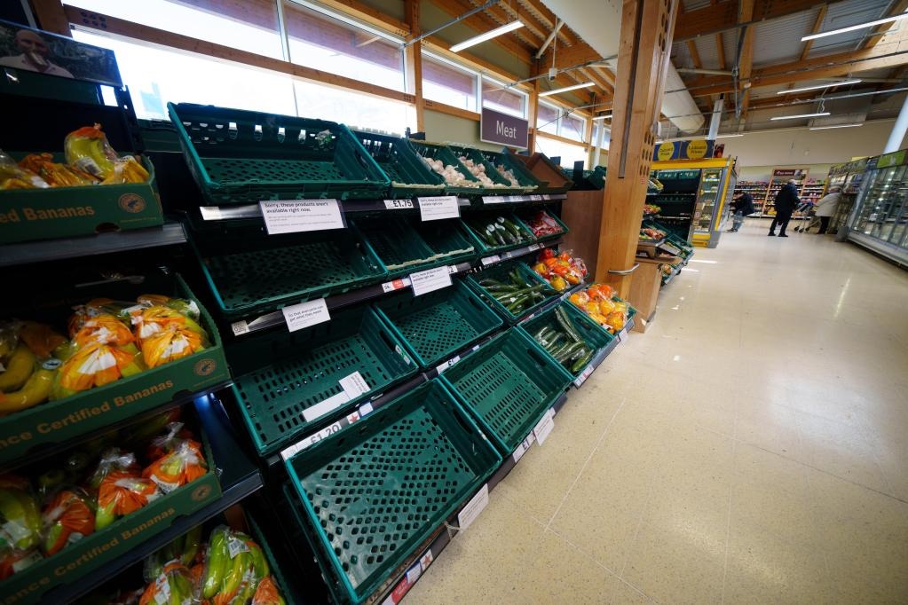 2月23日,在英國曼徹斯特,一家超市的水果和蔬菜貨架出現(xiàn)缺貨。新華社發(fā)(喬恩·休珀攝)