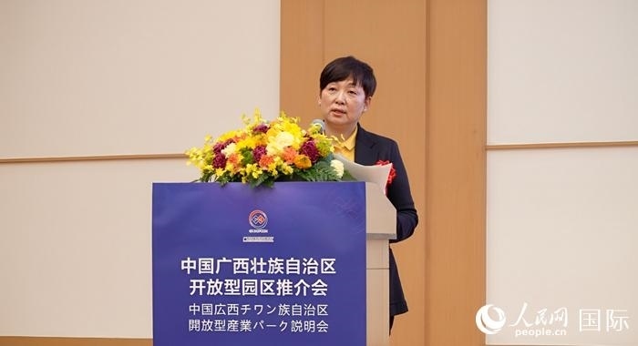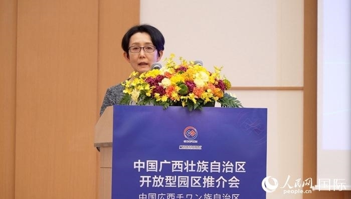 中國(guó)(廣西)自由貿(mào)易試驗(yàn)區(qū)工作辦公室專職副主任白嵐做主題推介時(shí),向日本經(jīng)濟(jì)產(chǎn)業(yè)界分享了廣西的四大發(fā)展機(jī)遇。
