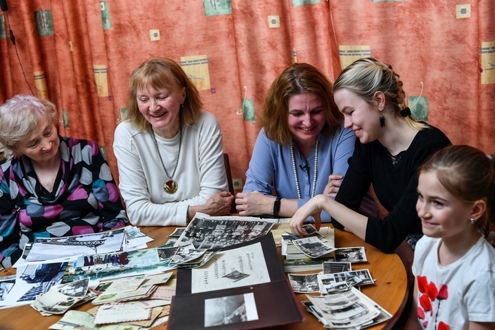 3月9日,援華專家西林之女葉蓮娜 (左一)和家人在接受新華社記者采訪時(shí),一起翻看老照片。新華社記者曹陽(yáng)攝