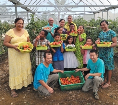 湯加農戶拉姆齊一家和中方技術人員一起展示大棚里采摘的蔬菜。本報記者 陳效衛(wèi)攝