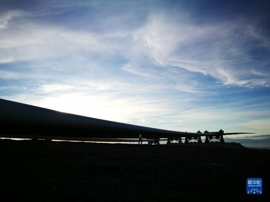 這張未標注時間的照片拍攝的是波黑伊沃維克風電場施工現(xiàn)場的風電葉片(手機照片)。新華社發(fā)(王馳攝)