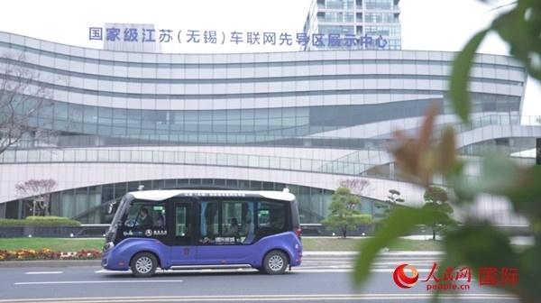行駛在無錫車聯(lián)網(wǎng)小鎮(zhèn)的無人駕駛小巴車。人民網(wǎng)記者 劉寧 攝