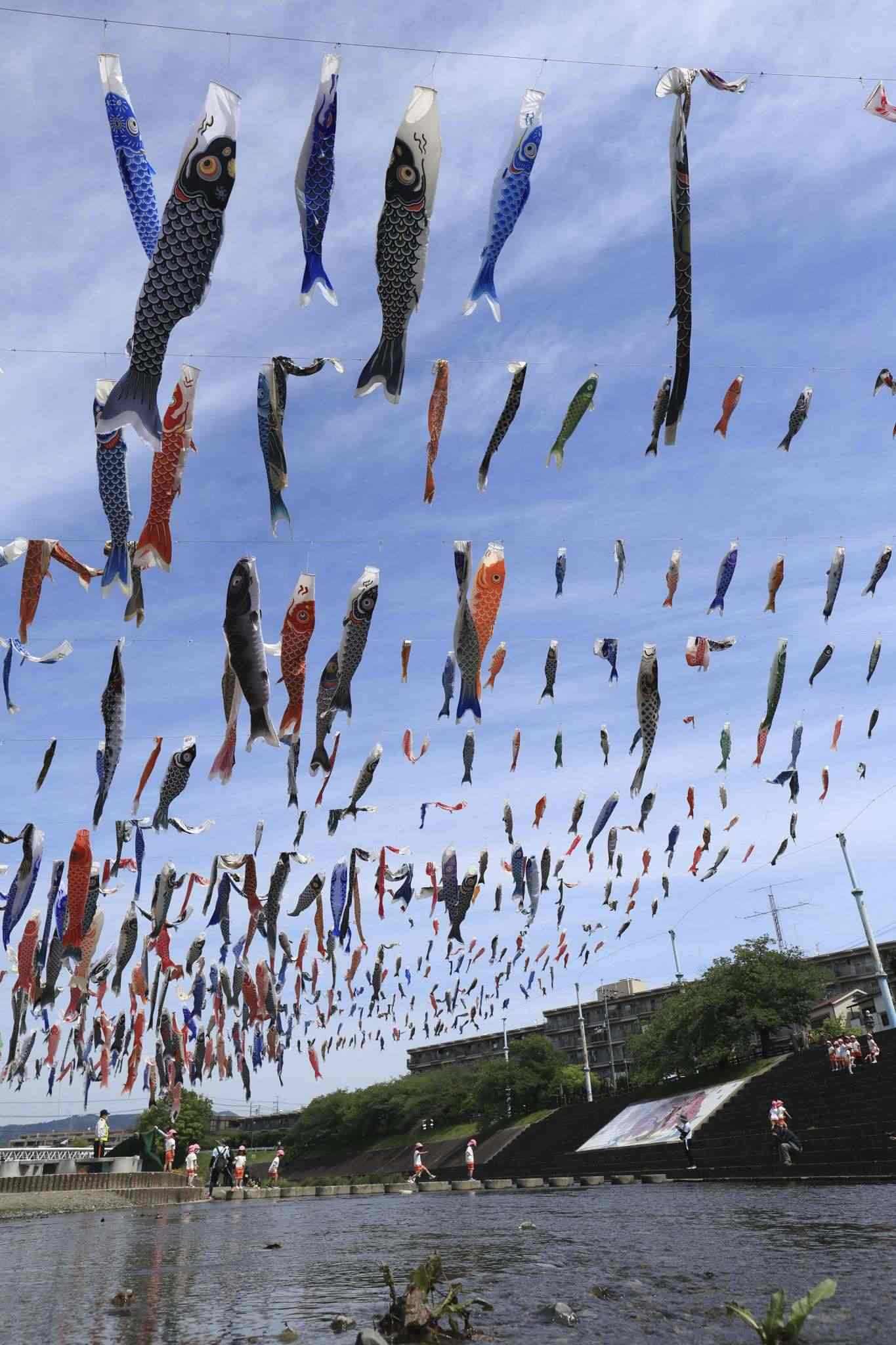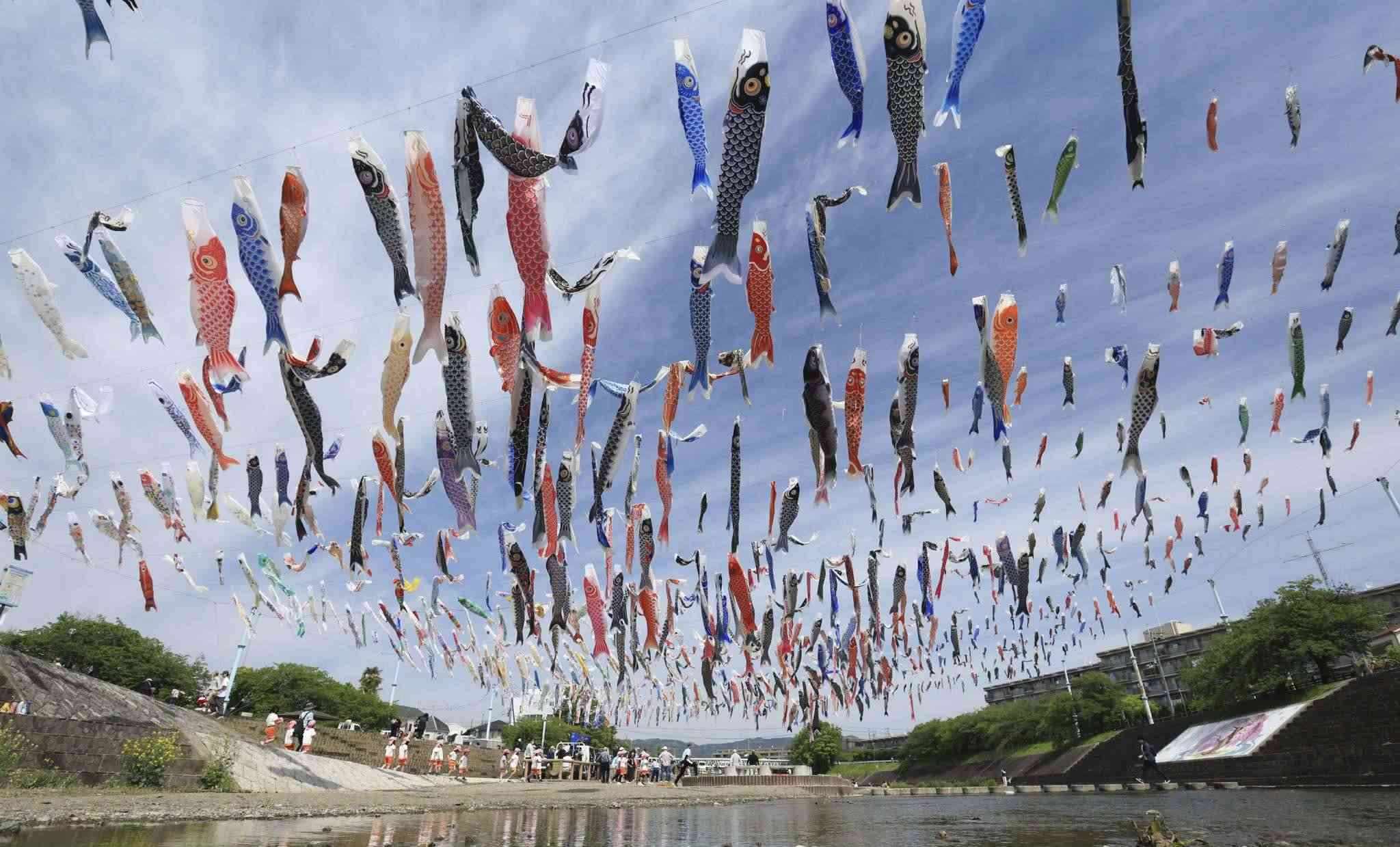 當?shù)貢r間2023年4月28日,日本大阪,大約1000條鯉魚旗在高摫市的秋田川河上空飄揚,慶祝5月5日兒童節(jié)。視覺中國