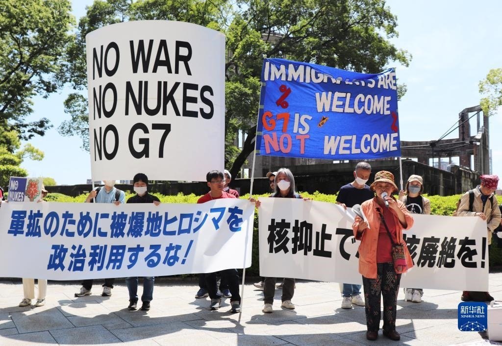 “不做戰(zhàn)爭幫兇”“不要G7”……14日,200多名日本民眾舉著各式標語,在廣島和平紀念公園原子彈轟炸遺址舉行集會,強烈抗議七國集團(G7)峰會將在廣島召開。