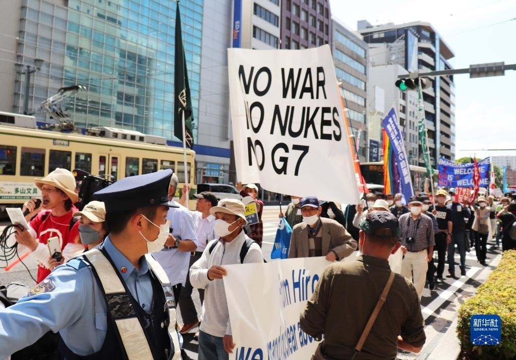 5月14日,在日本廣島街頭,日本民眾舉著“不要戰(zhàn)爭、不要核武器、不要G7”等標語,強烈抗議七國集團(G7)峰會將在廣島召開。新華社記者 楊光 攝