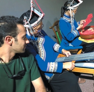 發(fā)展,是新疆留給納瓦爾的第一印象?!拔覀冏哌M了烏魯木齊這座中國西部的現(xiàn)代化城市,感受到了當?shù)孛癖姲簿訕窐I(yè)的生活。”在新疆國際大巴扎,種類繁多的干果、色彩斑斕的艾德萊斯綢等特色產(chǎn)品讓人目不暇接。“我遇到了一位手藝精湛的地毯師傅,他編織過程中的每一個手勢都充滿了韻律感。我陶醉于他的手藝,也被地毯精美且極具傳統(tǒng)特色的紋樣設(shè)計所吸引。我向他請教,他也熱情回答。我后來把這些美好的記憶都融入了作品當中。”納瓦爾說。