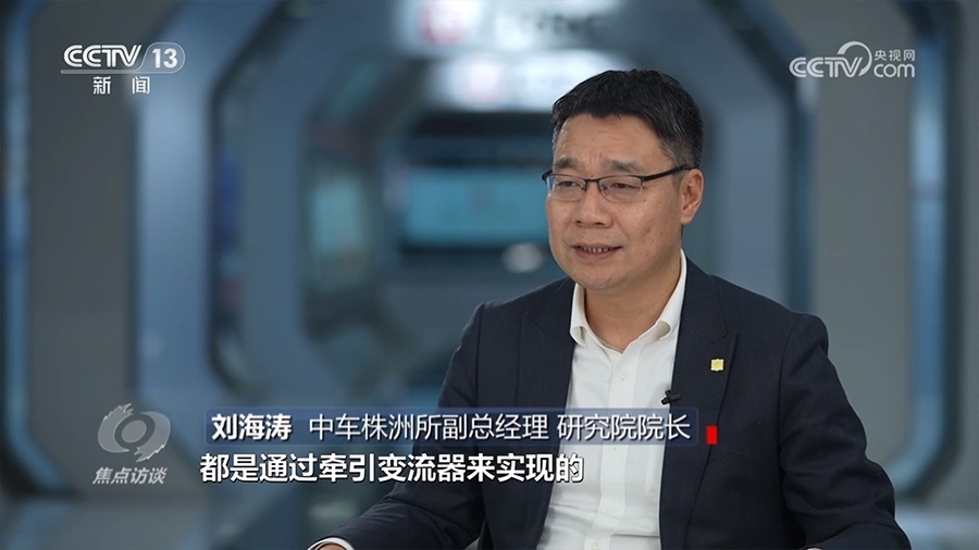 中車(chē)株洲所副總經(jīng)理、研究院院長(zhǎng)劉海濤:“在高鐵車(chē)窗上擺一枚硬幣,這枚硬幣在高鐵300公里時(shí)速運(yùn)行工況下依然非常平穩(wěn)。過(guò)程中的加減速以及恒速控制,都是通過(guò)牽引變流器實(shí)現(xiàn)的?!?/p>