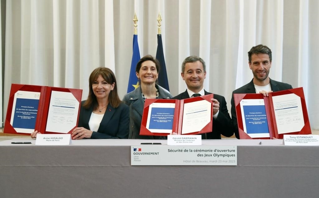 5月23日,為確保巴黎奧運(yùn)會(huì)“河上”開幕式安全順利舉行,法國(guó)內(nèi)政部、巴黎奧組委、巴黎市政府三方在巴黎簽訂協(xié)議,明確各自的安保職責(zé)。新華社記者 高靜 攝