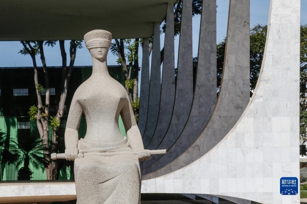 這是5月22日在巴西首都巴西利亞三權(quán)廣場聯(lián)邦最高法院前拍攝的一尊雕像。