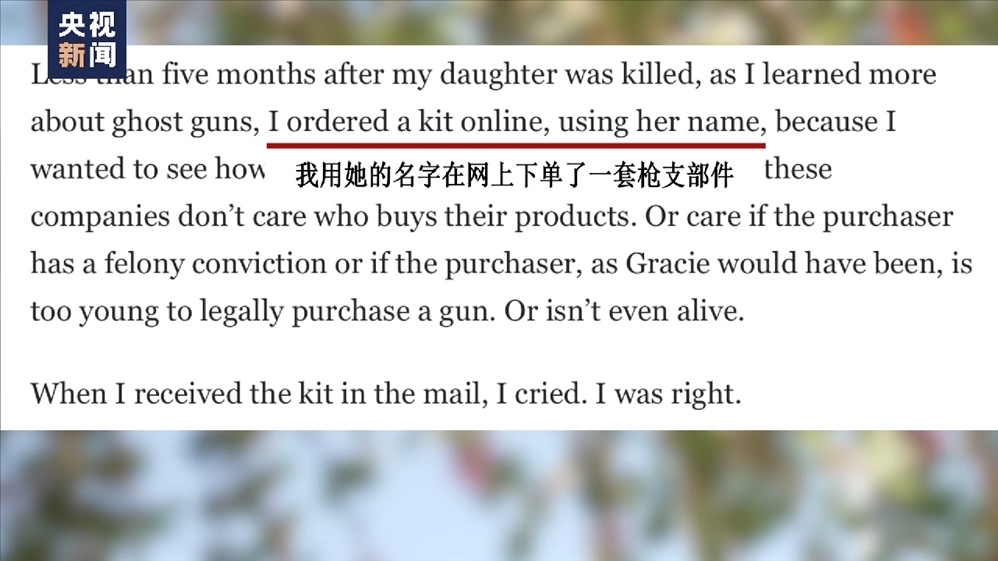槍擊案發(fā)生不到五個月后,遇害者之一格雷斯·穆爾伯格的父親用已逝女兒的名字成功訂購到一套“幽靈槍”的槍支部件,他在《華盛頓郵報》分享了這個經(jīng)歷,以此揭露“幽靈槍”行業(yè)的黑暗。