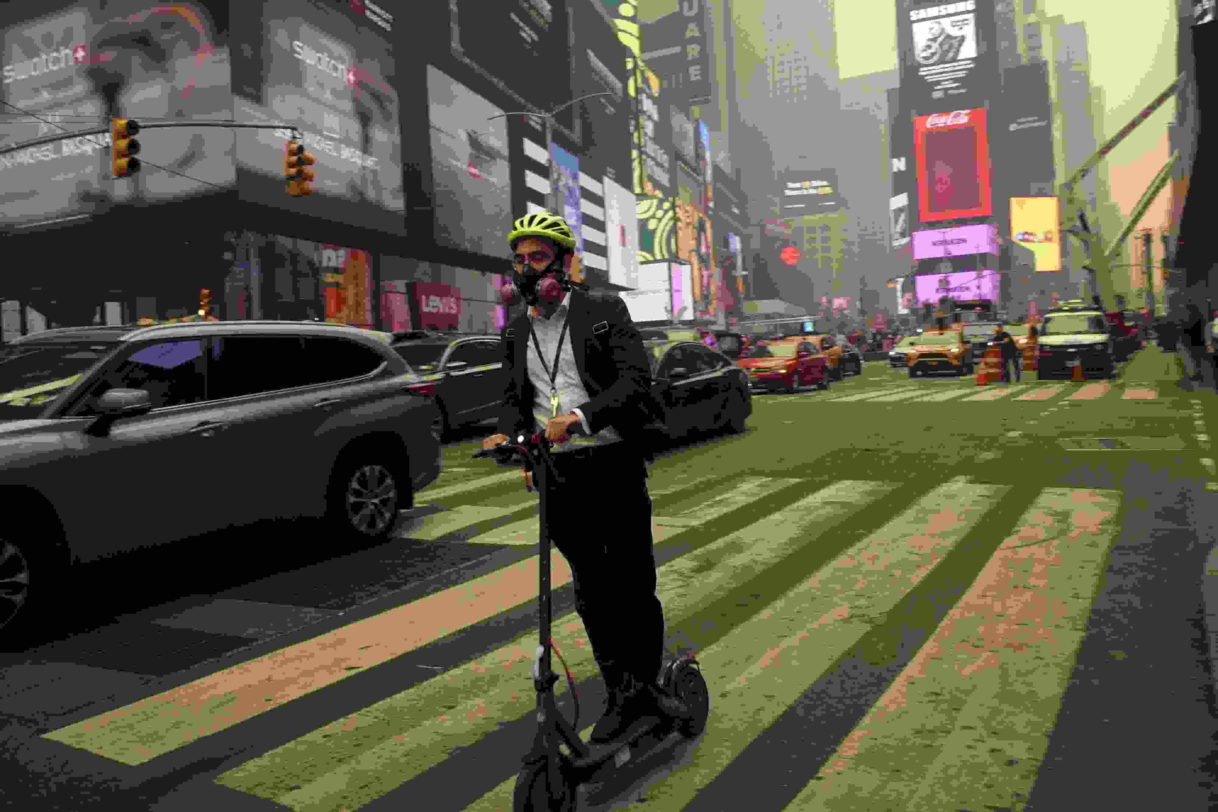 當(dāng)?shù)貢r間6月7日,美國紐約時報廣場的一位騎行者佩戴著呼吸過濾器。近日,加拿大野火產(chǎn)生的煙霧蔓延至美國,紐約市出現(xiàn)霧霾,戶外民眾嚴(yán)密防護。 視覺中國