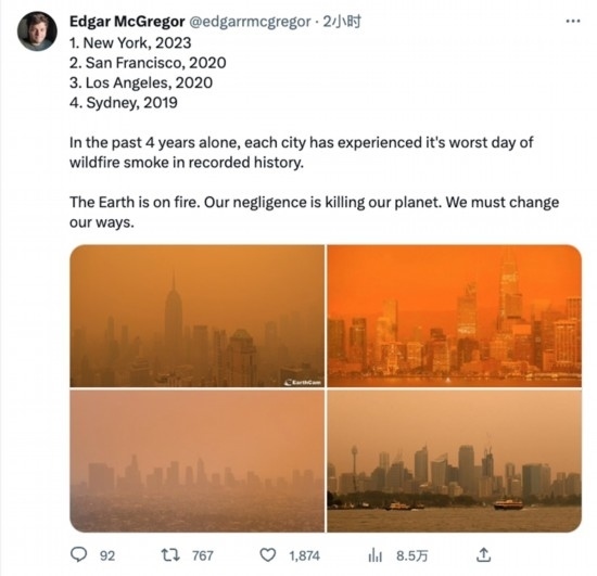 6月7日,紐約市深陷加拿大山火導致的煙霾之時,有網(wǎng)友在社交媒體上列出2019年悉尼、2020年洛杉磯和舊金山、2023年紐約的類似污染畫面,并留言道:“地球在著火”“我們必須作出改變”。