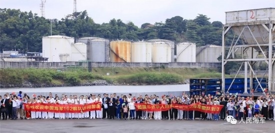 當(dāng)日上午9時(shí),懸掛著中加兩國國旗的編隊(duì)艦艇緩緩靠泊奧文多港碼頭,中國駐加蓬大使李津津及使館工作人員、當(dāng)?shù)刂匈Y機(jī)構(gòu)人員、華人華僑代表,加蓬國防部秘書長彭吉中將及官兵代表等300余人位碼頭迎接。