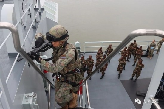 微山湖艦上,編隊(duì)特戰(zhàn)隊(duì)員向加方海軍陸戰(zhàn)隊(duì)員介紹了我特戰(zhàn)武器裝備,演示教授了滑降和艙室搜索等科目,并與加方海軍陸戰(zhàn)隊(duì)員進(jìn)行了反恐反海盜、武力營救等專業(yè)交流。