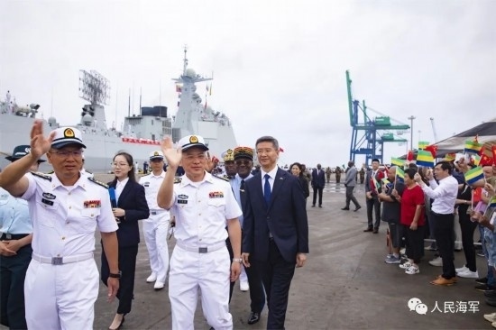 在加蓬海軍軍樂隊(duì)的奏樂聲中,迎接人群揮舞著中加兩國國旗,熱烈歡迎編隊(duì)到來。編隊(duì)官兵們在甲板上整齊列隊(duì),向人群揮手致意。