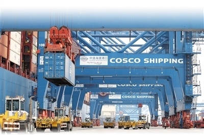 中遠(yuǎn)海運(yùn)港口阿聯(lián)酋阿布扎比碼頭采用岸橋預(yù)留自動(dòng)化和堆場(chǎng)自動(dòng)化作業(yè)模式,可作業(yè)超2萬(wàn)標(biāo)準(zhǔn)箱大型船舶,年設(shè)計(jì)能力250萬(wàn)標(biāo)準(zhǔn)箱。本報(bào)中東中心分社 納達(dá)爾·達(dá)烏德攝